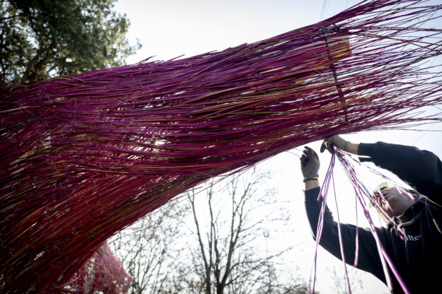 Inspired by the weaver birds, this particular species, called Philetairus socius or the Sociable Weaver, has a remarkable way of weaving its home. They are one of the very few species that create collective, community nests. This collaboratively created sculpture is part of a larger artistic research that searches for more sensitive and careful ways of living together, ways of living and of being that are tuned to natural life and its flows.